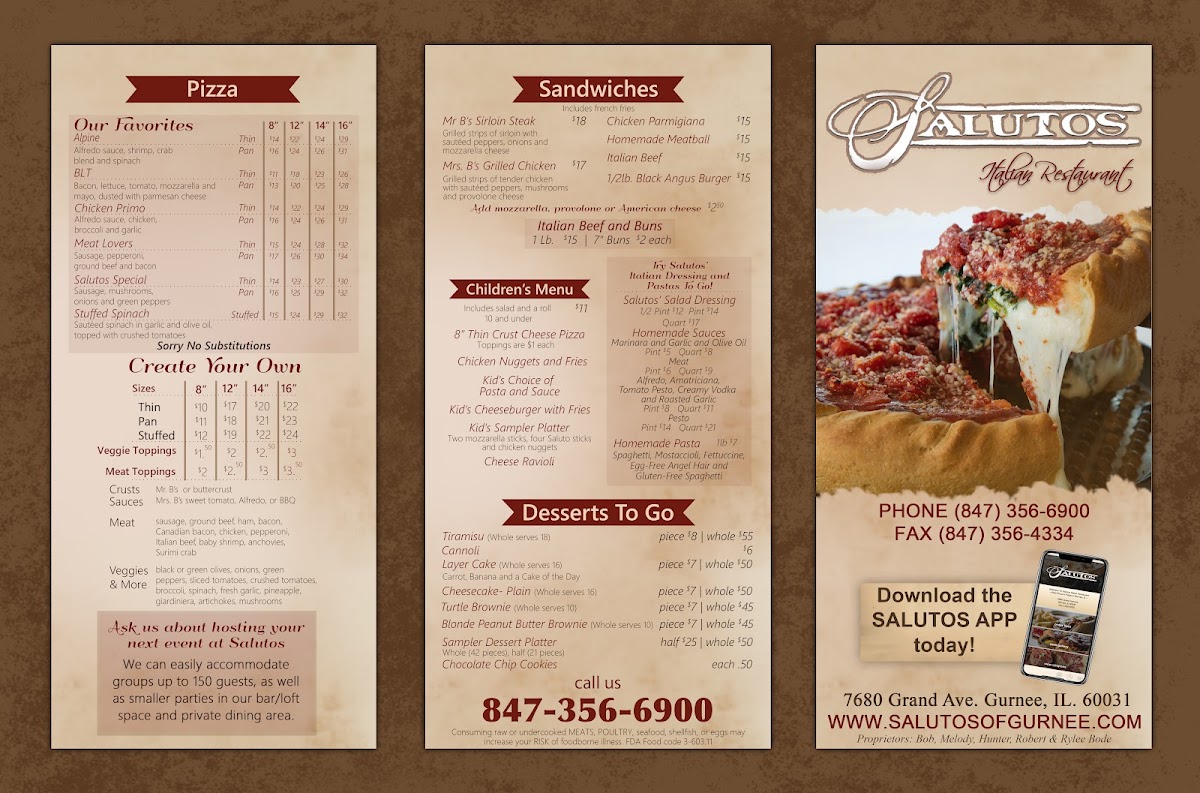 sausage (Salutos-Style on pan or stuffed pizzas), ground beef, ham, bacon, Canadian bacon, chicken, pepperoni, Italian beef, baby shrimp, anchovies, Surimi crab